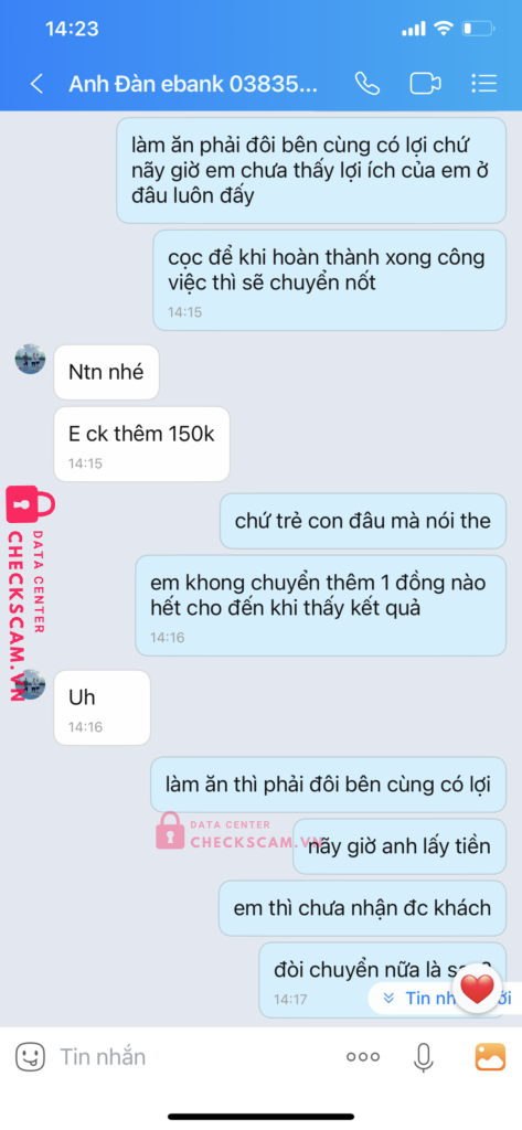 Mới đầu kêu cọc 400k rồi có đủ tk thì nhận tiếp nhưng sau đó đòi thêm 150k thì lại giả vờ không nhận được. Lừa đảo chuyển tiền đã check với tổng đài viên tiền đã vào nhưng vẫn giả vờ không nhận được.