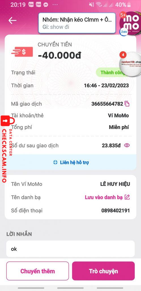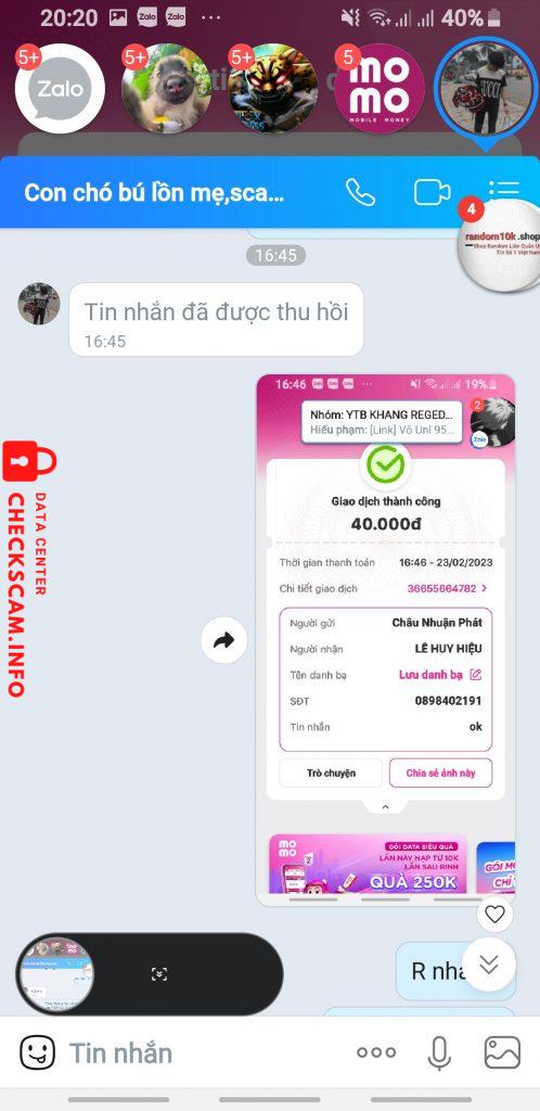 Scammer Alert: LÊ HUY HIỆU Reported: November 16, 2024 Scammer Information Full Name: LÊ HUY HIỆU Phone Number: 0898402191 Payment Gate: MOMO Payment Account: 0898402191 Category: Marketplace scams Source: Checkscam Evidence Files Report Description Scam bán tk mk mbbank Comments Your comment Add Comment No comments yet. Be the first to share your experience with this scammer.