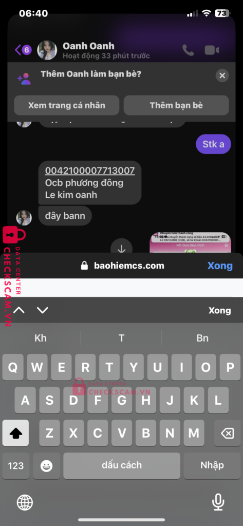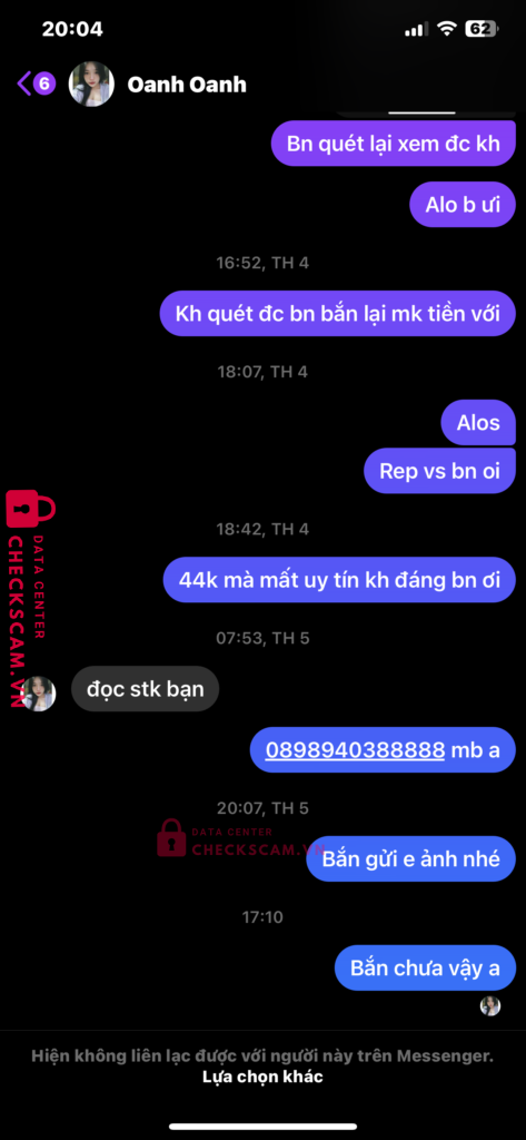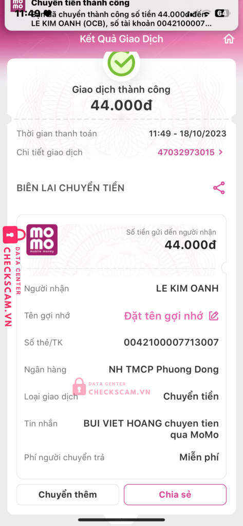Scammer Alert: Le kim oanh Reported: November 16, 2024 Scammer Information Full Name: Le kim oanh Payment Gate: Ocb phương đông Payment Account: 0042100007713007 Category: Marketplace scams Source: Checkscam Evidence Files Report Description Không quét được mã rồi không hoàn lại tiền bảo gửi stk bank lại nhưng chặn luôn Comments Your comment Add Comment No comments yet. Be the first to share your experience with this scammer.