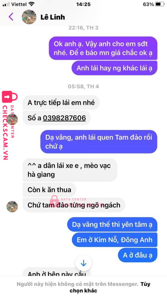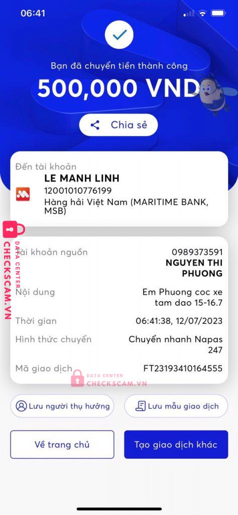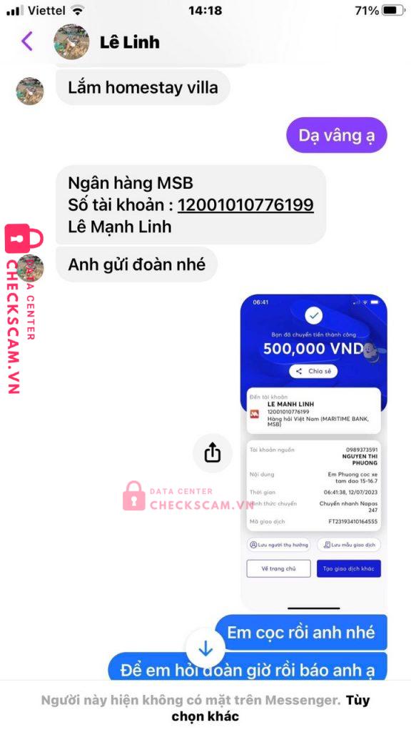 Lê Mạnh Linh là số tài khoản cũng như tên Zalo, tên facebook là Lê Linh lừa là lái xe cho thuê xe 29 chỗ, rồi yêu cầu mình cọc 500k. Nhưng đến ngày đi mình đã bị chặn và không tìm thấy facebook nữa