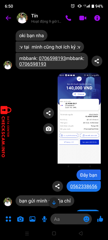 Scammer Alert: Lê Minh Duy Reported: November 16, 2024 Scammer Information Full Name: Lê Minh Duy Payment Gate: MbBank Payment Account: 0706598193 Category: Marketplace scams Source: Checkscam Evidence Files Report Description Scam 140k Quên ko check uy tín tài khoản trên web H nhận ra đã muộn Comments Your comment Add Comment No comments yet. Be the first to share your experience with this scammer.