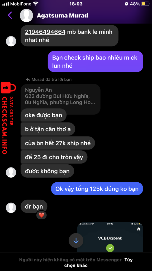Scammer Alert: Lê Minh Nhật Reported: November 16, 2024 Scammer Information Full Name: Lê Minh Nhật Payment Gate: Ngân hàng quân đội Payment Account: 21946494664 Category: Marketplace scams Source: Checkscam Evidence Files Report Description Lừa đảo chuyển khoản khi mua hàng online Comments Your comment Add Comment No comments yet. Be the first to share your experience with this scammer.