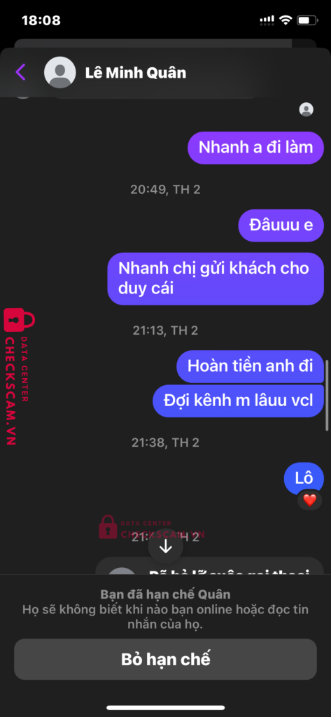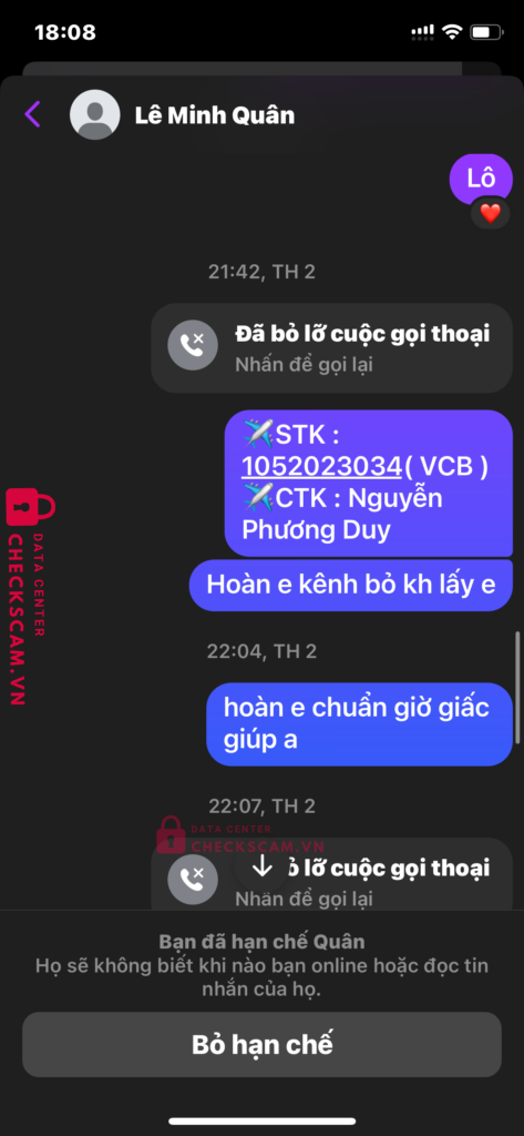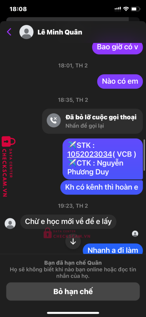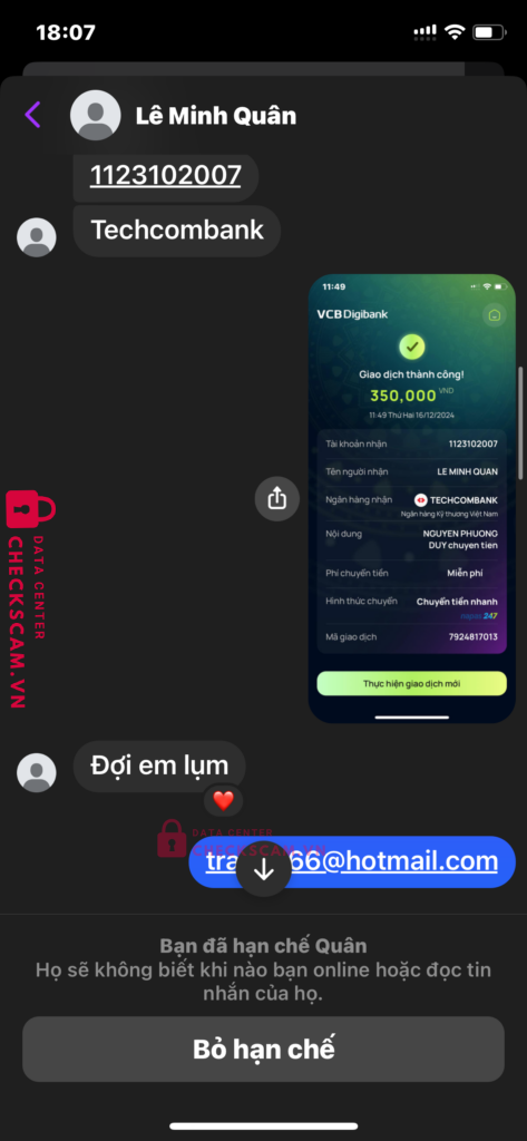 Scammer Alert: Lê Minh Quân Reported: March 7, 2025 Scammer Information Full Name: Lê Minh Quân Payment Gate: Techcombank Payment Account: 1123102007 Category: Marketplace scams Source: Checkscam Evidence Files Report Description Scam anh em né Comments Your comment Add Comment No comments yet. Be the first to share your experience with this scammer.