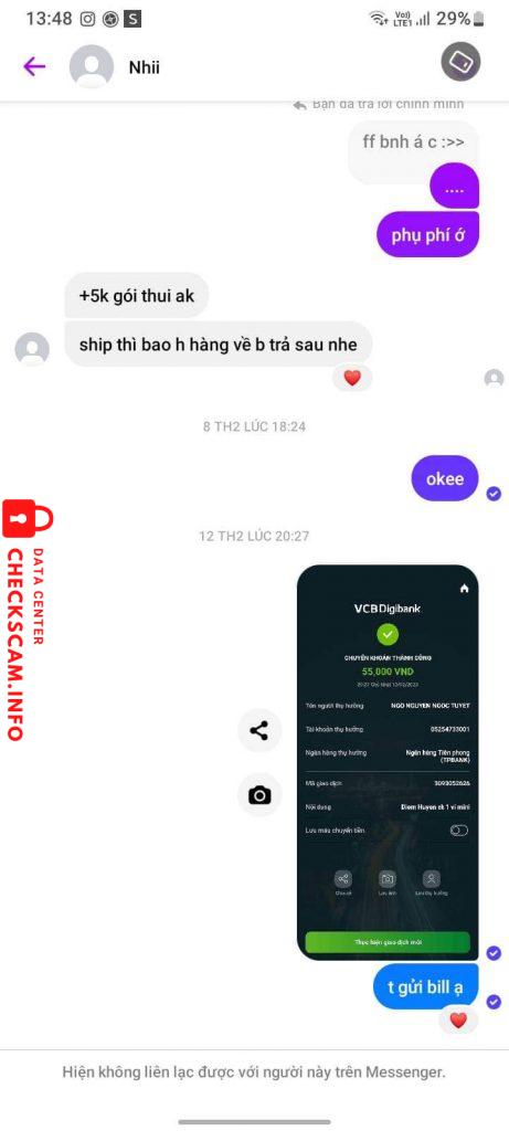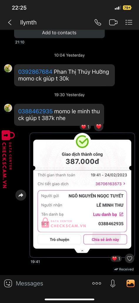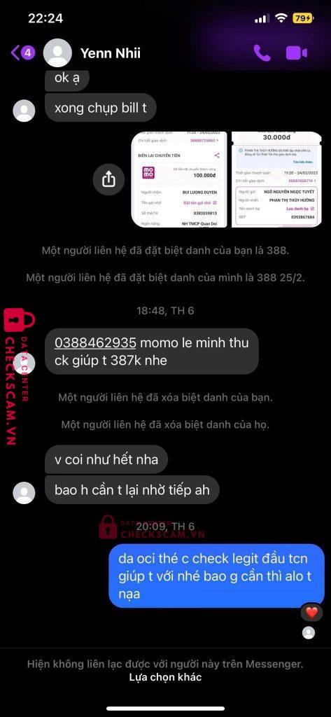 Scammer Alert: Lê Minh Thu Reported: November 16, 2024 Scammer Information Full Name: Lê Minh Thu Phone Number: 0388462935 Payment Gate: Momo Payment Account: 0388462935 Category: Marketplace scams Source: Checkscam Evidence Files Report Description Scammer Comments Your comment Add Comment No comments yet. Be the first to share your experience with this scammer.