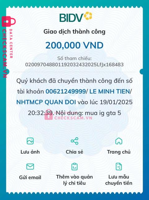 Scammer Alert: LE MINH TIEN Reported: March 7, 2025 Scammer Information Full Name: LE MINH TIEN Payment Gate: MB BANK Payment Account: 00621249999 Category: Marketplace scams Source: Checkscam Evidence Files Report Description scam tiền ig trong gta 5, nó còn bảo admin trung gian nữa, đồng bọn Comments Your comment Add Comment No comments yet. Be the first to share your experience with this scammer.