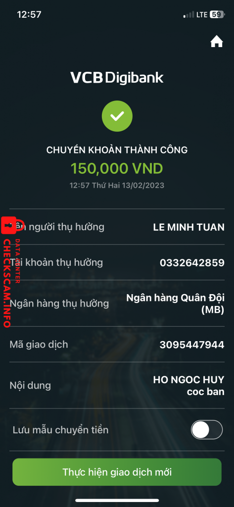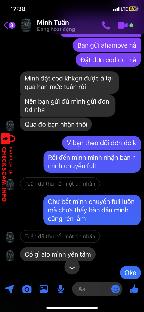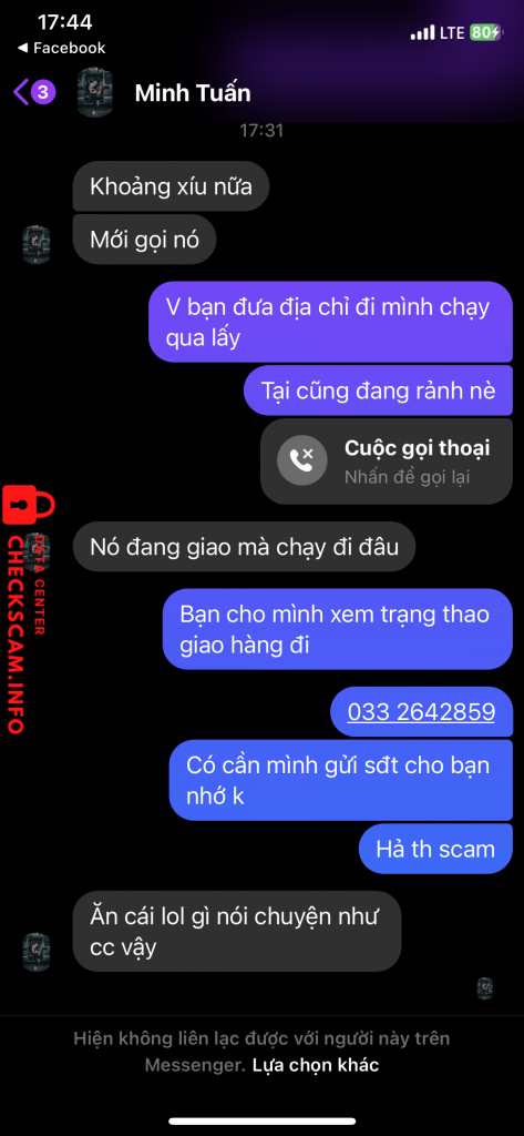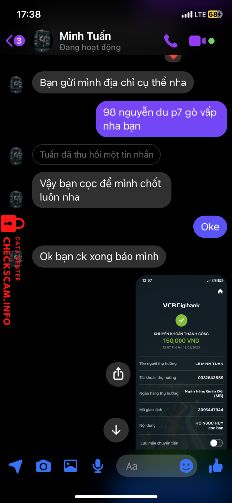 Scammer Alert: Lê Minh Tuấn Reported: November 16, 2024 Scammer Information Full Name: Lê Minh Tuấn Phone Number: 0943082640 Payment Gate: MBbank Payment Account: 0332642859 Category: Marketplace scams Source: Checkscam Evidence Files Report Description Bán hàng bàn ghế tủ đồ gia dụng trên các nhóm buôn bán với giá rẻ rồi cọc để ship hàng luôn. Mọi người cẩn thận nhé Comments Your comment Add Comment No comments yet. Be the first to share your experience with this scammer.