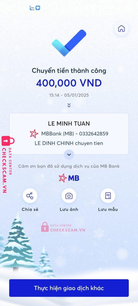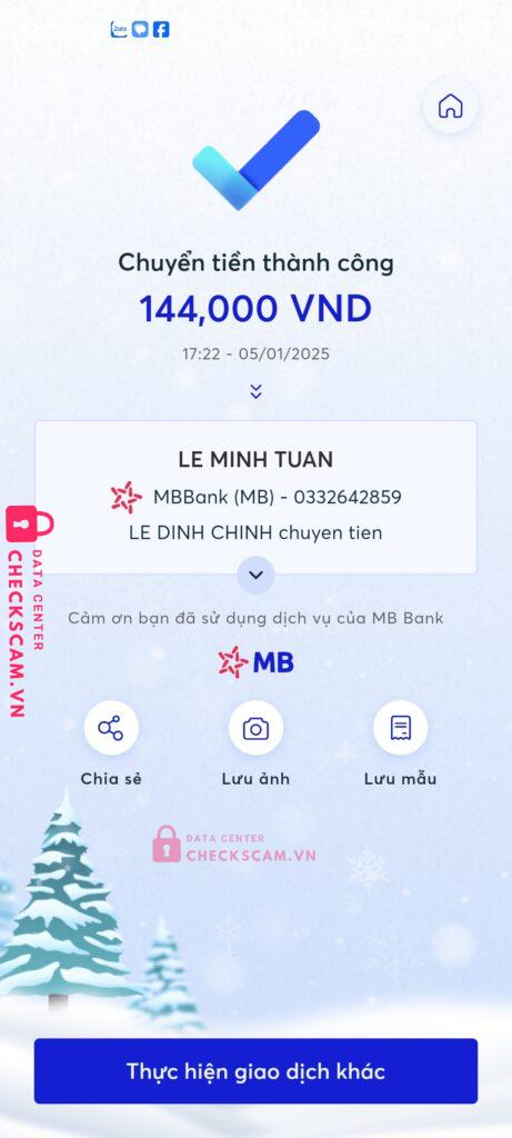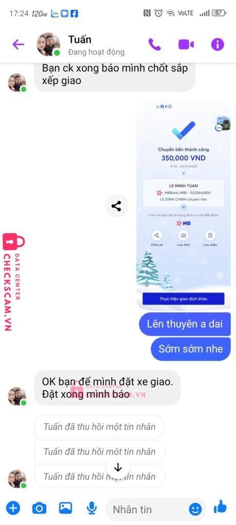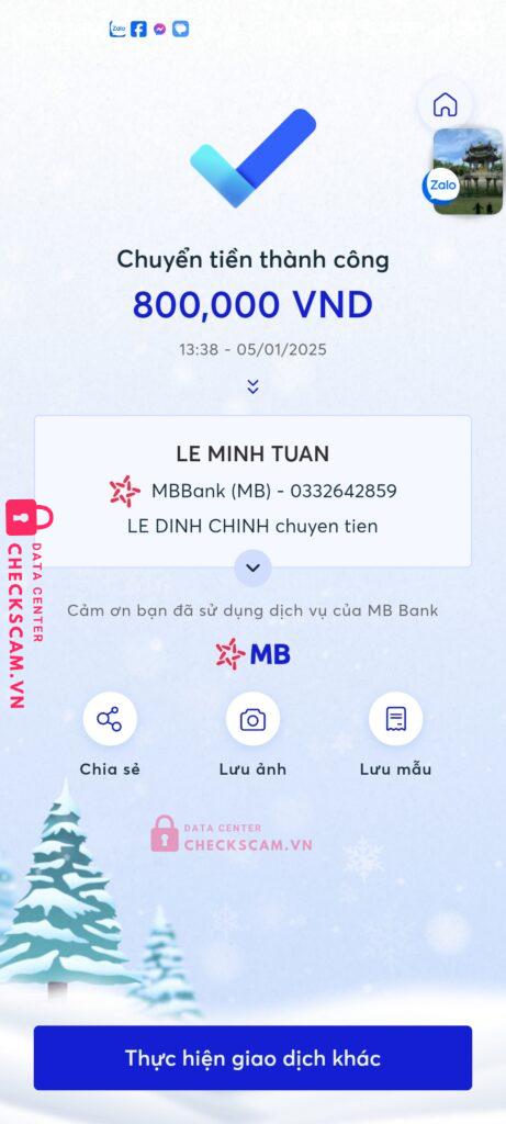 Scammer Alert: LE MINH TUAN Reported: March 7, 2025 Scammer Information Full Name: LE MINH TUAN Payment Gate: MBbank Payment Account: 0332642859 Category: Marketplace scams Source: Checkscam Evidence Files Report Description Thông qua mua bán nội thất lừa người tiêu dùng bằng cách chuyển khoản Comments Your comment Add Comment No comments yet. Be the first to share your experience with this scammer.