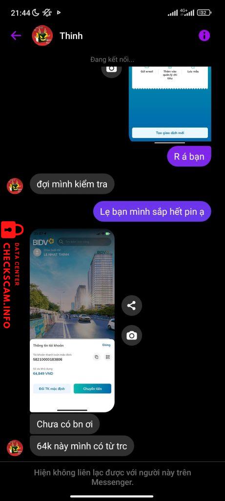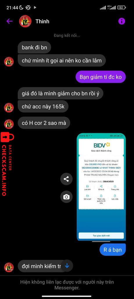 Scammer Alert: LE NHAT THINH Reported: November 16, 2024 Scammer Information Full Name: LE NHAT THINH Payment Gate: BIDV Payment Account: 58210000183806 Category: Marketplace scams Source: Checkscam Evidence Files Report Description Scam acc bên dragon city Comments Your comment Add Comment No comments yet. Be the first to share your experience with this scammer.