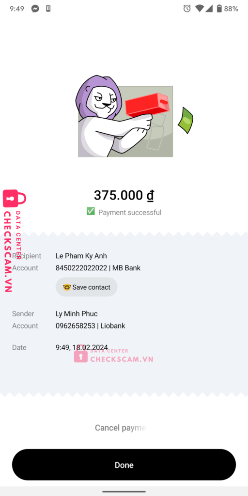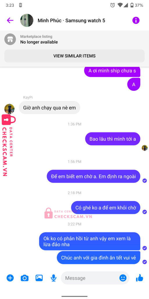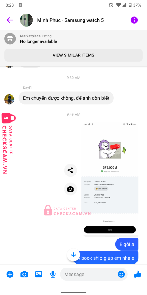 Scammer Alert: Lê Phạm Kỳ Anh Reported: November 16, 2024 Scammer Information Full Name: Lê Phạm Kỳ Anh Payment Gate: MB Bank Payment Account: 8450222022022 Category: Marketplace scams Source: Checkscam Evidence Files Report Description Lừa đảo bán đồng hồ samsung Comments Your comment Add Comment No comments yet. Be the first to share your experience with this scammer.
