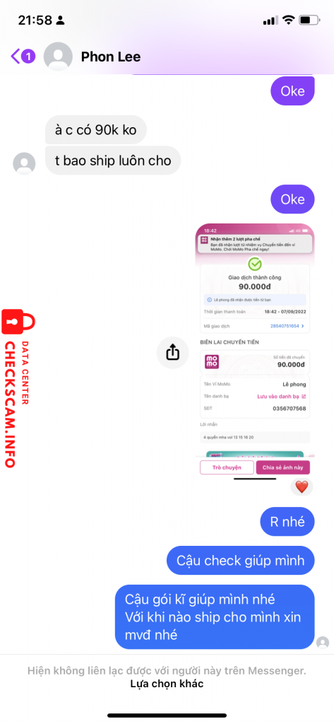 Scammer Alert: Lê Phong Reported: November 16, 2024 Scammer Information Full Name: Lê Phong Phone Number: 0356707568 Payment Gate: ACB bank Payment Account: 9519956868 Category: Marketplace scams Source: Checkscam Evidence Files Report Description Scam Comments Your comment Add Comment No comments yet. Be the first to share your experience with this scammer.