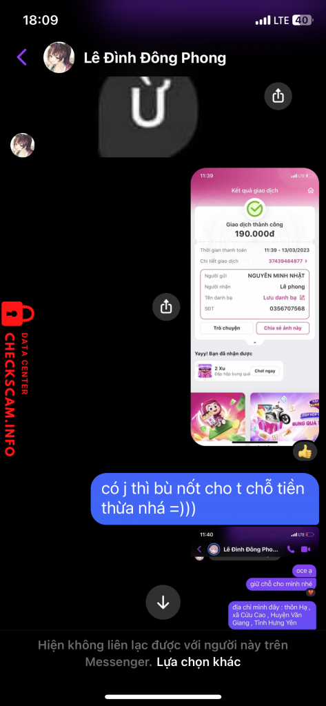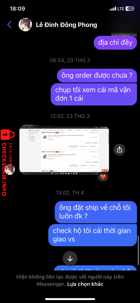 Scammer Alert: Lê Phong Reported: November 16, 2024 Scammer Information Full Name: Lê Phong Phone Number: 0356707568 Payment Gate: ACB bank Payment Account: 9519956868 Category: Marketplace scams Source: Checkscam Evidence Files Report Description nhận đặt hộ sách , lấy ảnh mạng lừa người mua , khi đã nhận được tiền chuyển khoản thì chặn Comments Your comment Add Comment No comments yet. Be the first to share your experience with this scammer.