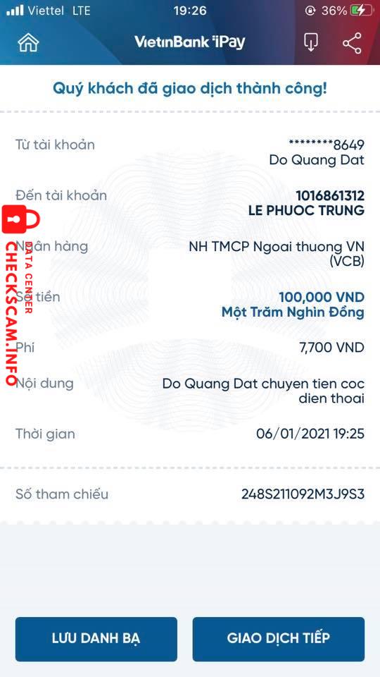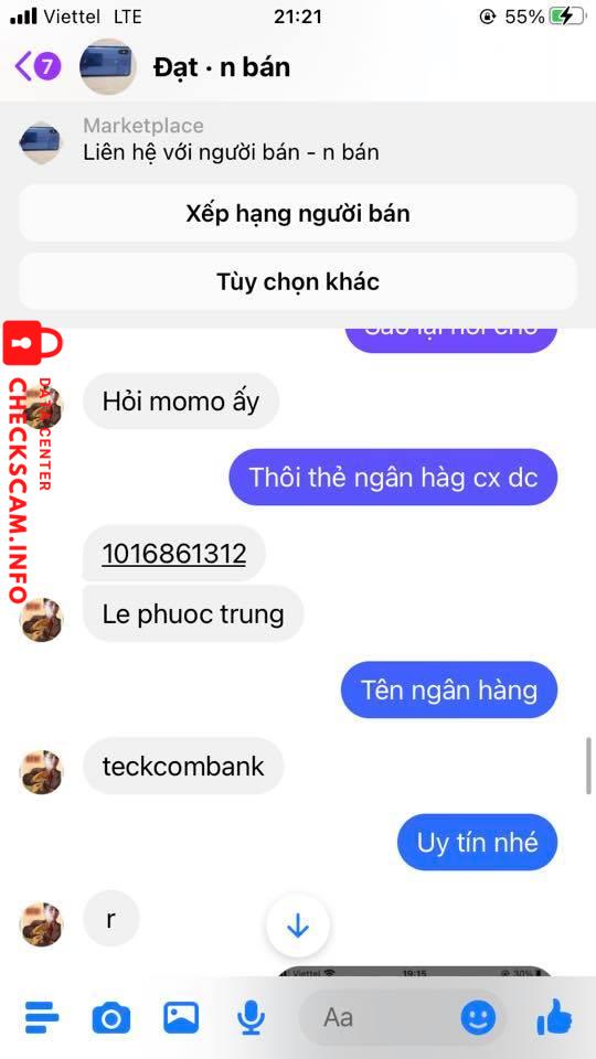 Scammer Alert: Le Phuoc Trung Reported: November 16, 2024 Scammer Information Full Name: Le Phuoc Trung Payment Gate: Vietcombank Payment Account: 1016861312 Category: Marketplace scams Source: Checkscam Evidence Files Report Description Mn cẩn thận con cho này lừa đảo nhé Comments Your comment Add Comment No comments yet. Be the first to share your experience with this scammer.