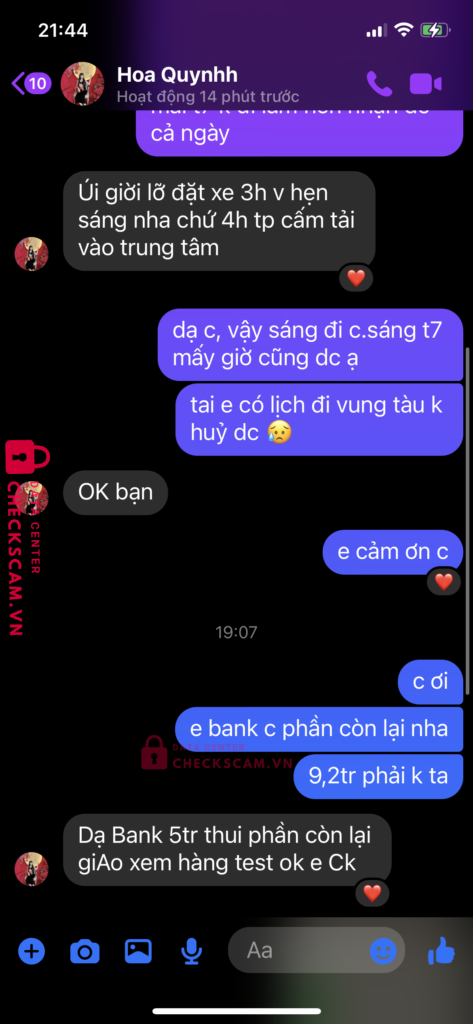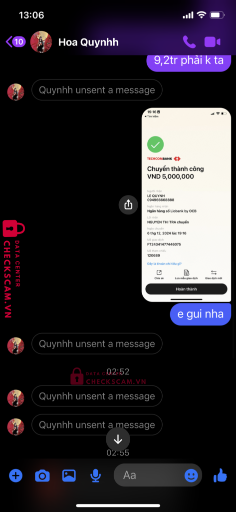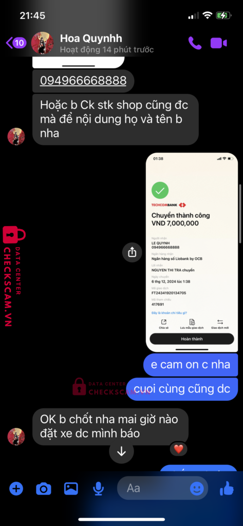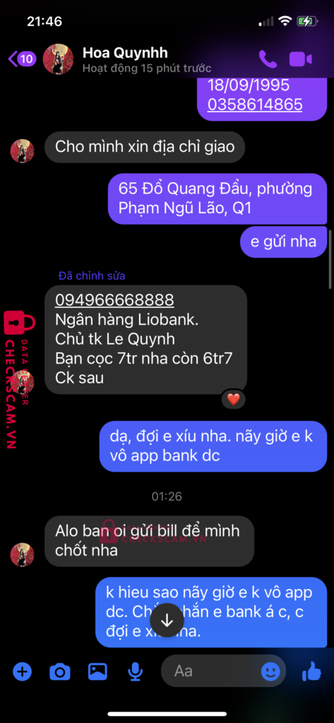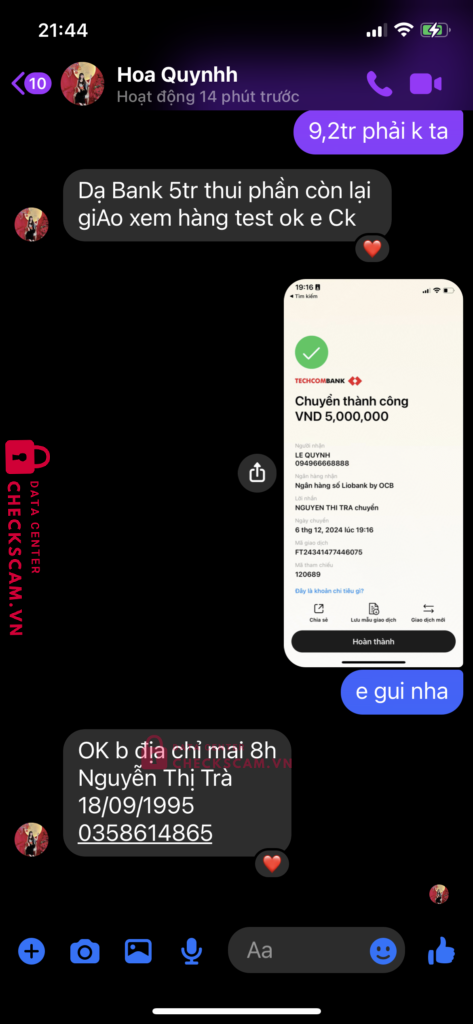 Scammer Alert: Le Quynh Reported: March 7, 2025 Scammer Information Full Name: Le Quynh Payment Gate: Lion bank Payment Account: 094966668888 Category: Marketplace scams Source: Checkscam Evidence Files Report Description Lừa đảo bán hàng thanh lý nội thất cũ, người mua chuyển tiền xong chặn facebook Comments Your comment Add Comment No comments yet. Be the first to share your experience with this scammer.