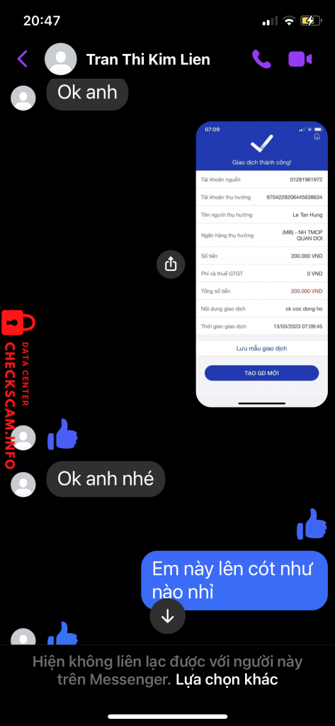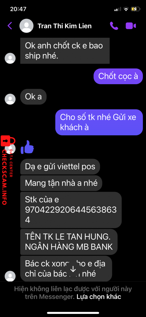 Scammer Alert: Le tan hung Reported: November 16, 2024 Scammer Information Full Name: Le tan hung Payment Gate: Mb bank Payment Account: 9704229206445638634 Category: Marketplace scams Source: Checkscam Evidence Files Report Description Lừa tiền cọc mua hàng Comments Your comment Add Comment No comments yet. Be the first to share your experience with this scammer.