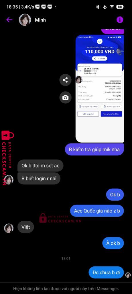 Scammer Alert: LE TAN TRUNG Reported: November 16, 2024 Scammer Information Full Name: LE TAN TRUNG Payment Gate: Mb Bank Payment Account: 0232811599999 Category: Marketplace scams Source: Checkscam Evidence Files Report Description Scam bán tài khoản. Comments Your comment Add Comment No comments yet. Be the first to share your experience with this scammer.