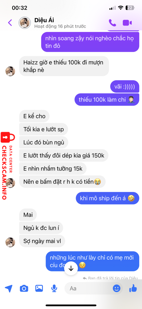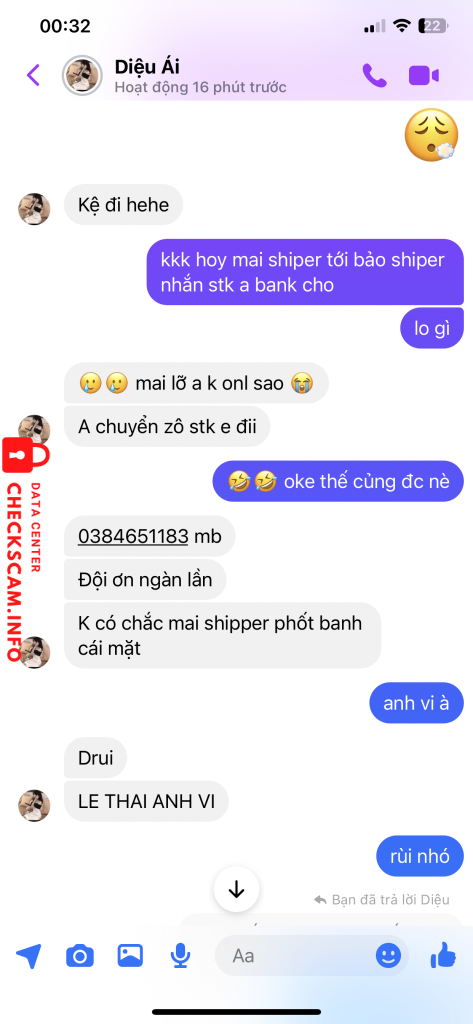 Scammer Alert: LE THAI ANH VI Reported: November 16, 2024 Scammer Information Full Name: LE THAI ANH VI Payment Gate: MB Payment Account: 0384651183 Category: Marketplace scams Source: Checkscam Evidence Files Report Description Chiếm đoạt nick fb nhắn tin người quen chuyển tiền Comments Your comment Add Comment No comments yet. Be the first to share your experience with this scammer.