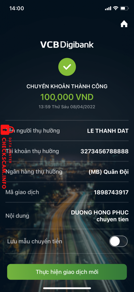 Scammer Alert: Le thanh dat Reported: November 16, 2024 Scammer Information Full Name: Le thanh dat Phone Number: 0909085632 Payment Gate: Mb bank Payment Account: 3273456788888 Category: Marketplace scams Source: Checkscam Evidence Files Report Description Lừa cọc mua hàng Comments Your comment Add Comment No comments yet. Be the first to share your experience with this scammer.
