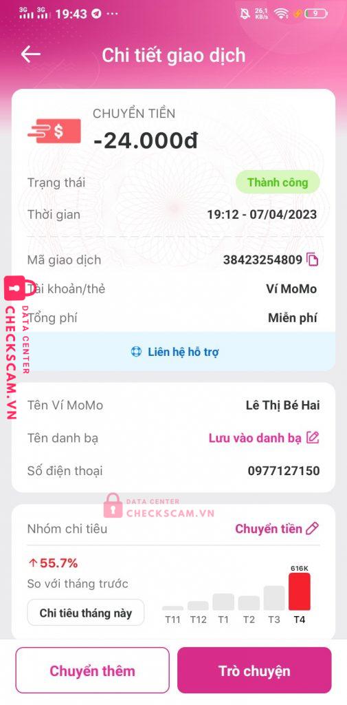 Scammer Alert: Lê Thị Bé Hai Reported: November 16, 2024 Scammer Information Full Name: Lê Thị Bé Hai Phone Number: 0977127150 Payment Gate: Momo Payment Account: 0977127150 Category: Marketplace scams Source: Checkscam Evidence Files Report Description Comments Your comment Add Comment No comments yet. Be the first to share your experience with this scammer.