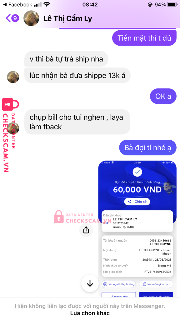 Scammer Alert: Lê thị Cẩm ly Reported: November 16, 2024 Scammer Information Full Name: Lê thị Cẩm ly Phone Number: 0817123942 Payment Gate: Mb Payment Account: 0817123942 Category: Marketplace scams Source: Checkscam Evidence Files Report Description Lừa đảo Comments Your comment Add Comment No comments yet. Be the first to share your experience with this scammer.