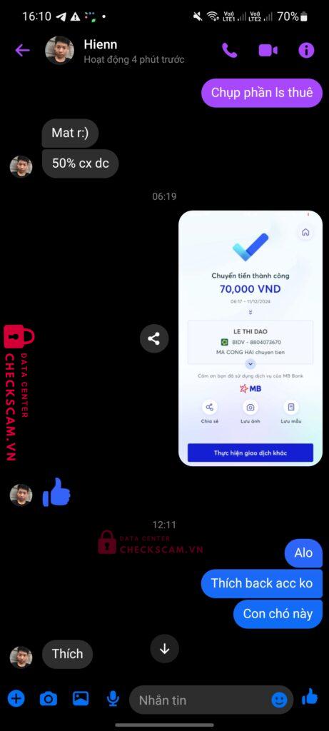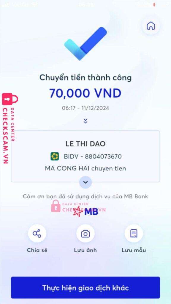 Scammer Alert: LE THI DAO Reported: March 7, 2025 Scammer Information Full Name: LE THI DAO Payment Gate: BIDV Payment Account: 8804073670 Category: Marketplace scams Source: Checkscam Evidence Files Report Description Bán Acc Thanh Toán Xong Lại Back Acc Trở Lại Comments Your comment Add Comment No comments yet. Be the first to share your experience with this scammer.