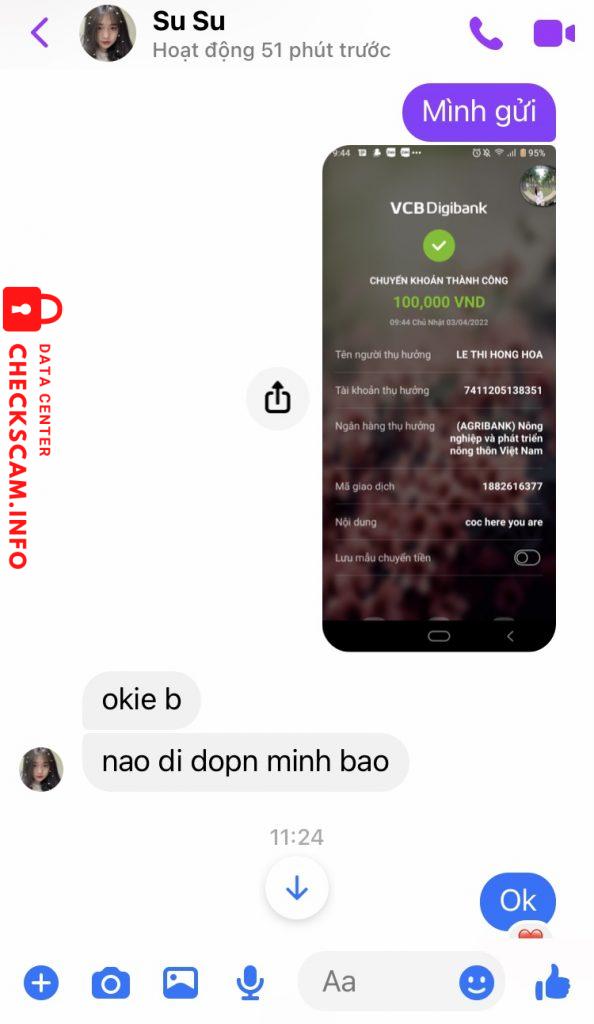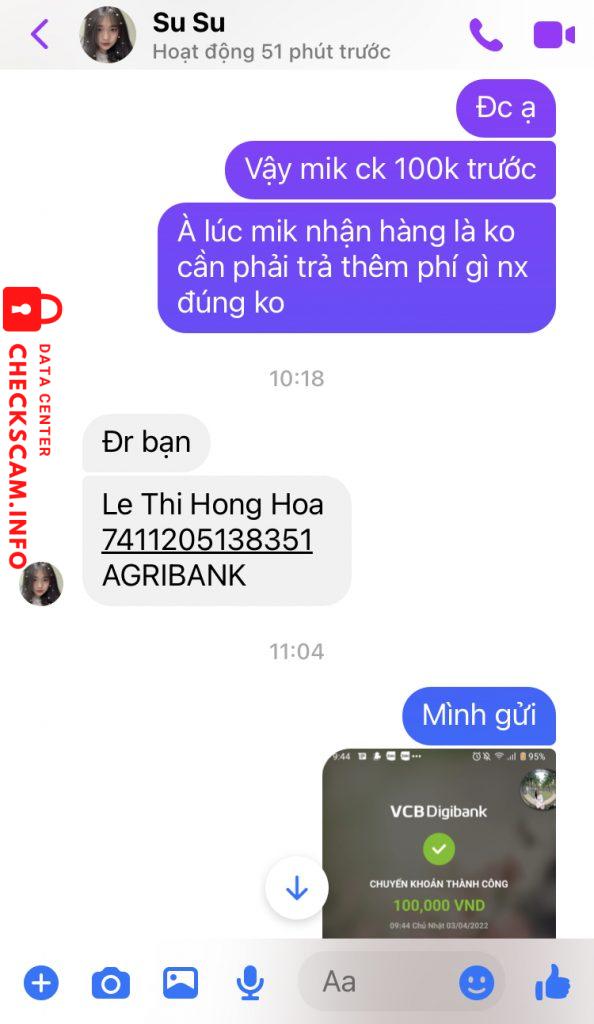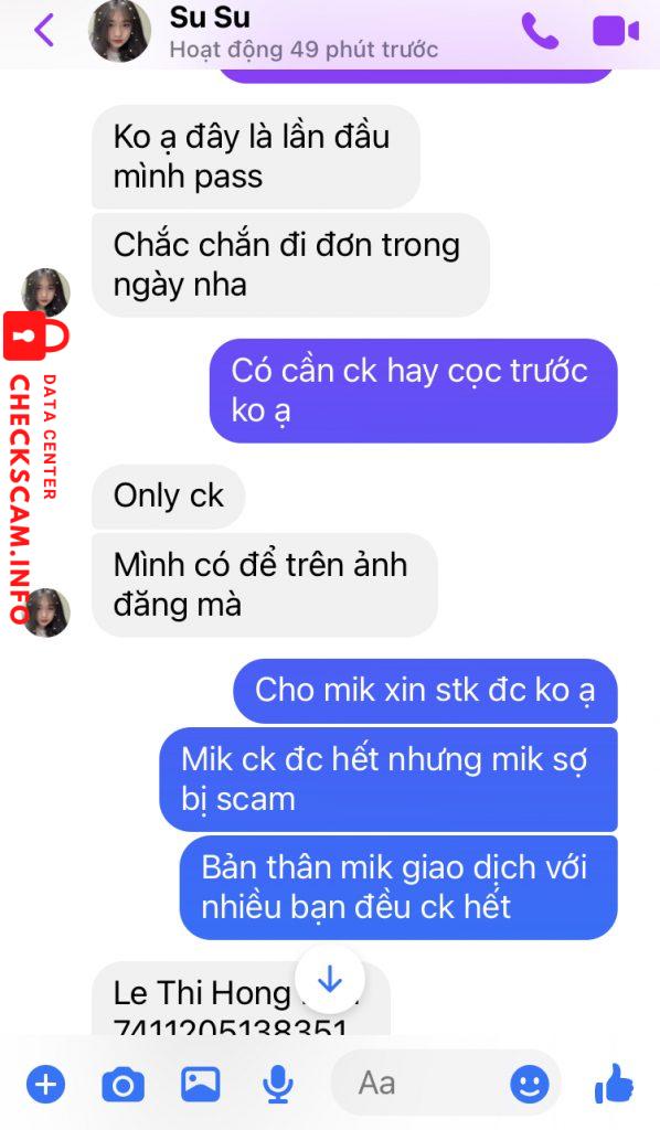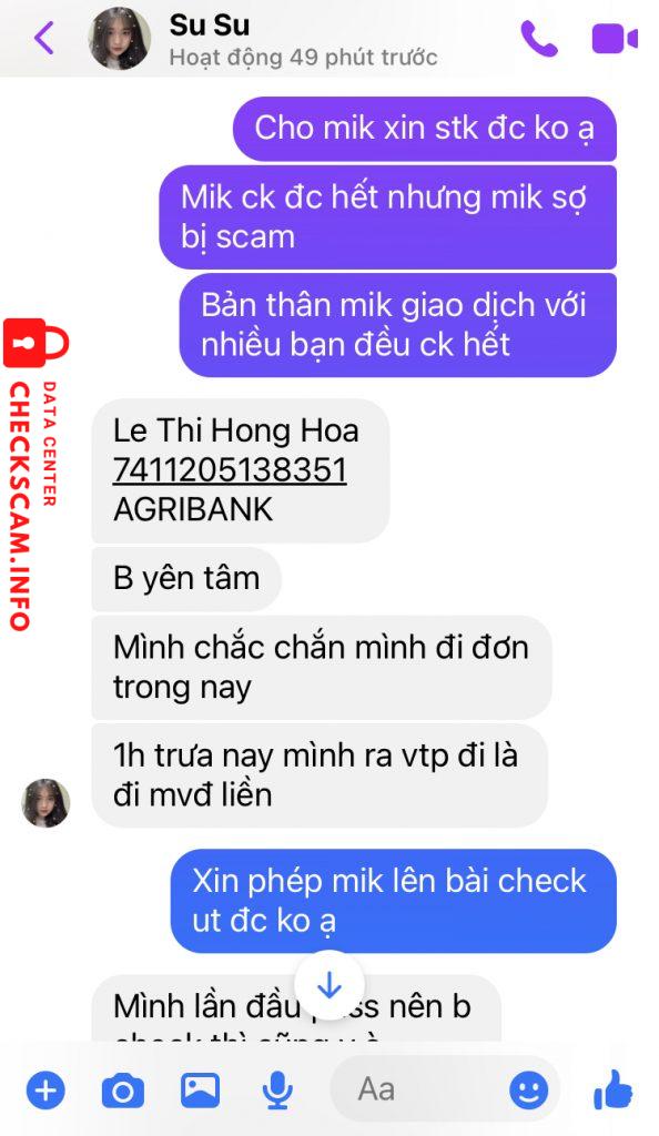Scammer Alert: Lê Thị Hồng Hoa Reported: November 16, 2024 Scammer Information Full Name: Lê Thị Hồng Hoa Payment Gate: Agribank Payment Account: 7411205138351 Category: Marketplace scams Source: Checkscam Evidence Files Report Description Lừa đảo tiền sách Comments Your comment Add Comment No comments yet. Be the first to share your experience with this scammer.