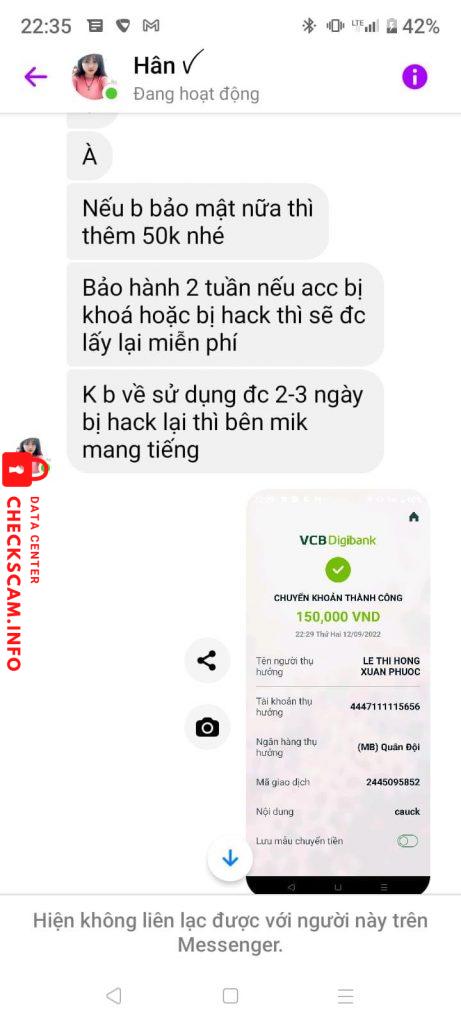 Scammer Alert: Lê Thị Hồng Xuân Phước Reported: November 16, 2024 Scammer Information Full Name: Lê Thị Hồng Xuân Phước Payment Gate: mbank Payment Account: 4447111115656 Category: Marketplace scams Source: Checkscam Evidence Files Report Description lừa đảo Comments Your comment Add Comment No comments yet. Be the first to share your experience with this scammer.