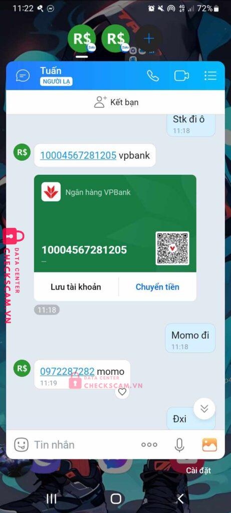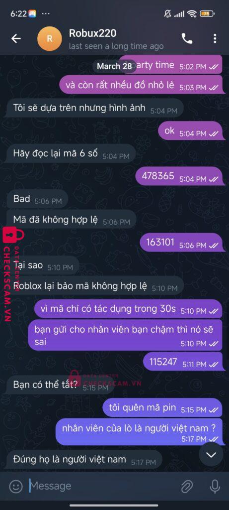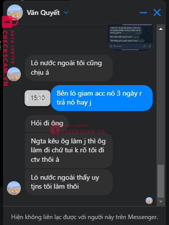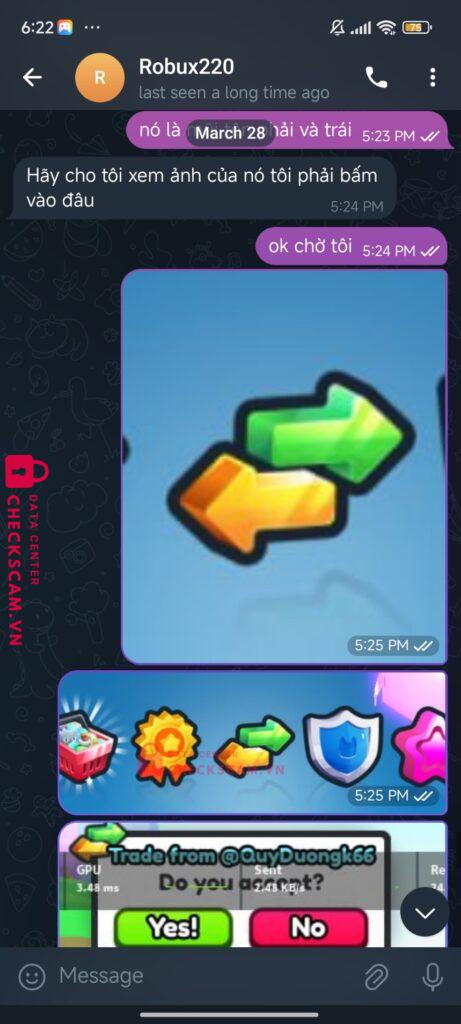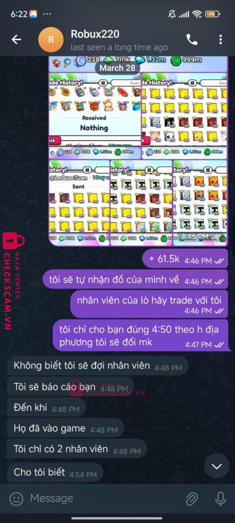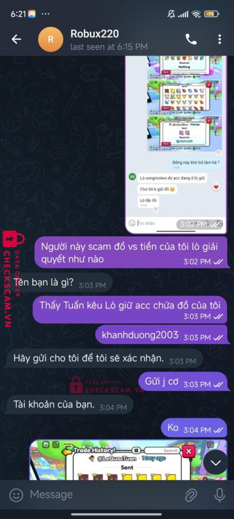 Tên này scam tôi hôm qua đến hôm nay tôi thấy tk hắn quảng cáo scam tôi có chat, scam sau đó thì tôi nhận được tin nhắn từ acc Văn Quyết và hắn đưa tôi nhắn sang telegram để nói chuyện tiếp. Hắn kêu tôi đưa acc để trade lại đồ đã mất từ hôm qua vì acc bây giờ không còn gì tôi đưa ngay và khi tôi vào hắn k bt phải làm gì chỉ trade 1 vài thứ sau một lúc tôi vào đã thấy bị scam.