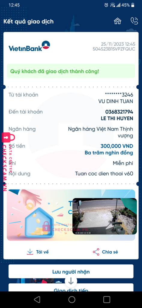 Scammer Alert: Lê Thị Huyền Reported: November 16, 2024 Scammer Information Full Name: Lê Thị Huyền Payment Gate: Ngân hàng Việt Nam Thịnh Vượng Payment Account: 0368321794 Category: Marketplace scams Source: Checkscam Evidence Files Report Description Lừa cọc chuyển khoản và 50% giá trị hàng hóa Comments Your comment Add Comment No comments yet. Be the first to share your experience with this scammer.