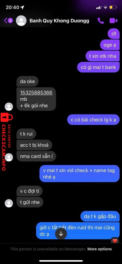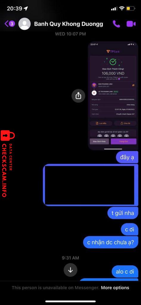Scammer Alert: LE THI KHANH LINH Reported: November 16, 2024 Scammer Information Full Name: LE THI KHANH LINH Payment Gate: Mb bank Payment Account: 15325885366 Category: Marketplace scams Source: Checkscam Evidence Files Report Description Lừa tiền, chuyển khoản xong rồi chặn, không gửi card Comments Your comment Add Comment No comments yet. Be the first to share your experience with this scammer.