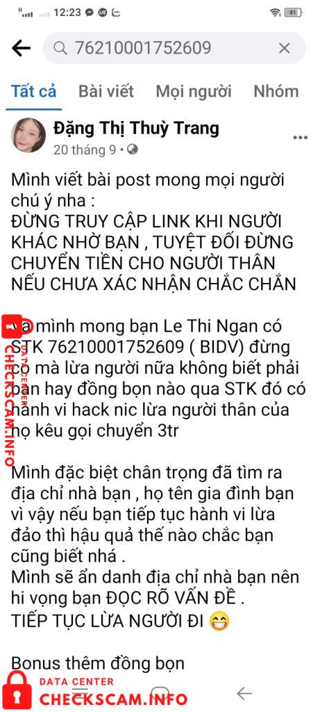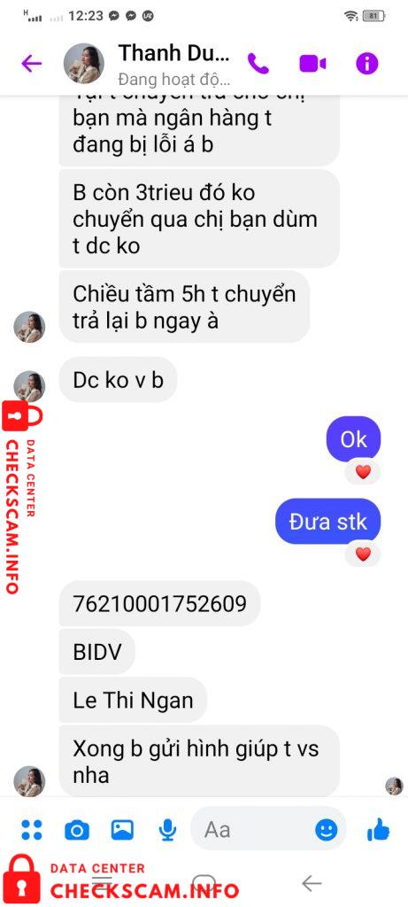Scammer Alert: Le Thi Ngan Reported: November 16, 2024 Scammer Information Full Name: Le Thi Ngan Phone Number: 76010001150403 Payment Gate: BIDV Payment Account: 8290107642002 Category: Marketplace scams Source: Checkscam Evidence Files Report Description Lừa chuyển tiền. Hack nick fb bạn bè ng quen Comments Your comment Add Comment No comments yet. Be the first to share your experience with this scammer.