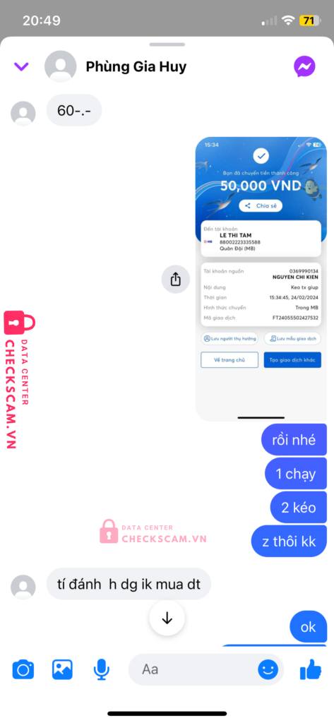 Scammer Alert: LE THI TAM Reported: November 16, 2024 Scammer Information Full Name: LE THI TAM Payment Gate: Mb bank Payment Account: 88002223335588 Category: Marketplace scams Source: Checkscam Evidence Files Report Description Đưa nó đánh từ tuần trước, nhắn k rep, kêu trả làm oai. Lq ae né ra nó sc acc Comments Your comment Add Comment No comments yet. Be the first to share your experience with this scammer.