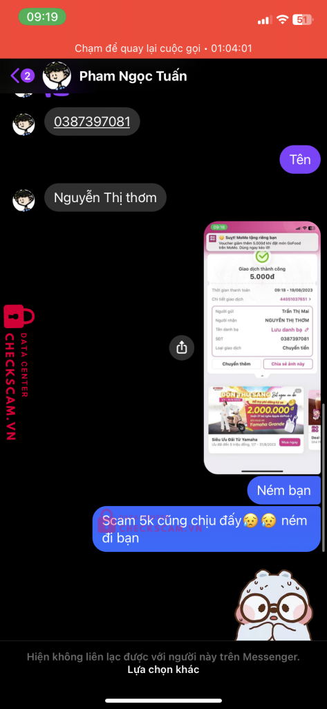 Scammer Alert: Lê Thị Thơm Reported: November 16, 2024 Scammer Information Full Name: Lê Thị Thơm Phone Number: 0387397081 Payment Gate: Momo Payment Account: 0387397081 Category: Marketplace scams Source: Checkscam Evidence Files Report Description Scam 5k Comments Your comment Add Comment No comments yet. Be the first to share your experience with this scammer.
