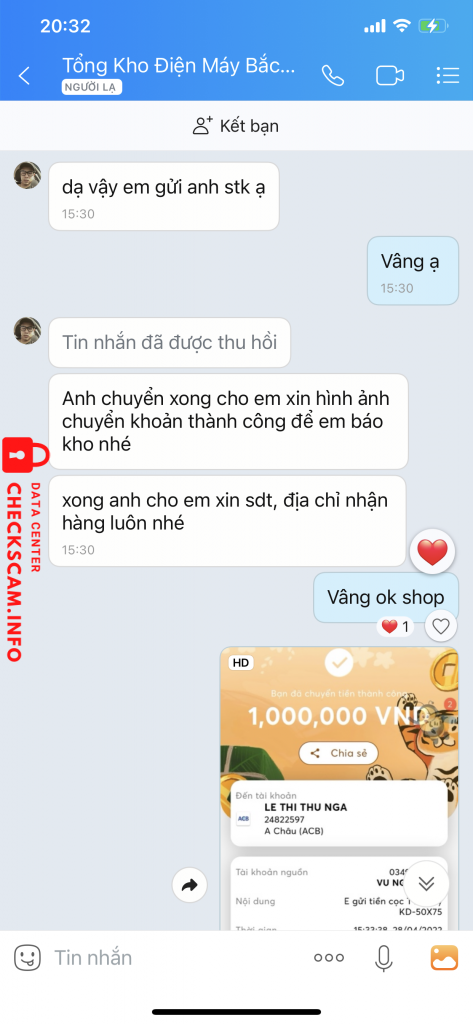 Scammer Alert: Lê Thị Thu Nga Reported: November 16, 2024 Scammer Information Full Name: Lê Thị Thu Nga Payment Gate: ACB Payment Account: 24822597 Category: Marketplace scams Source: Checkscam Evidence Files Report Description Con chó này chuyên đi lừa đảo. Mọi người ai bị nó lừa tố cáo nó lên công an nhé. Con chó này nó lừa đảo có hệ thống phải cho nó ở tù Comments Your comment Add Comment No comments yet. Be the first to share your experience with this scammer.