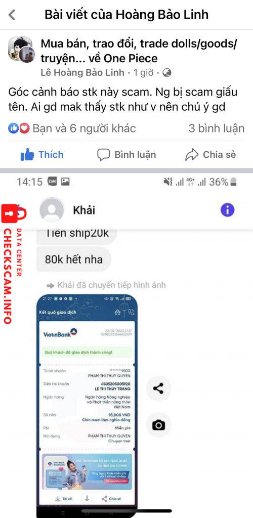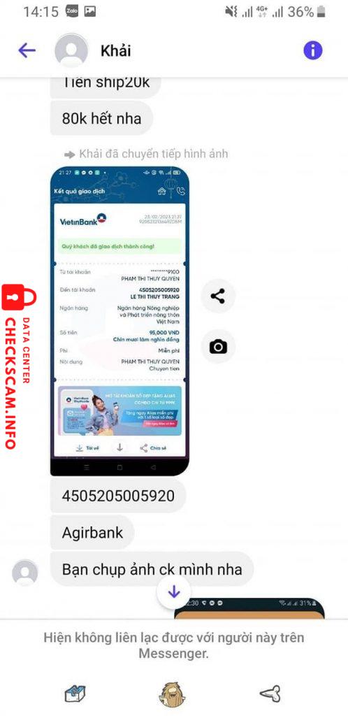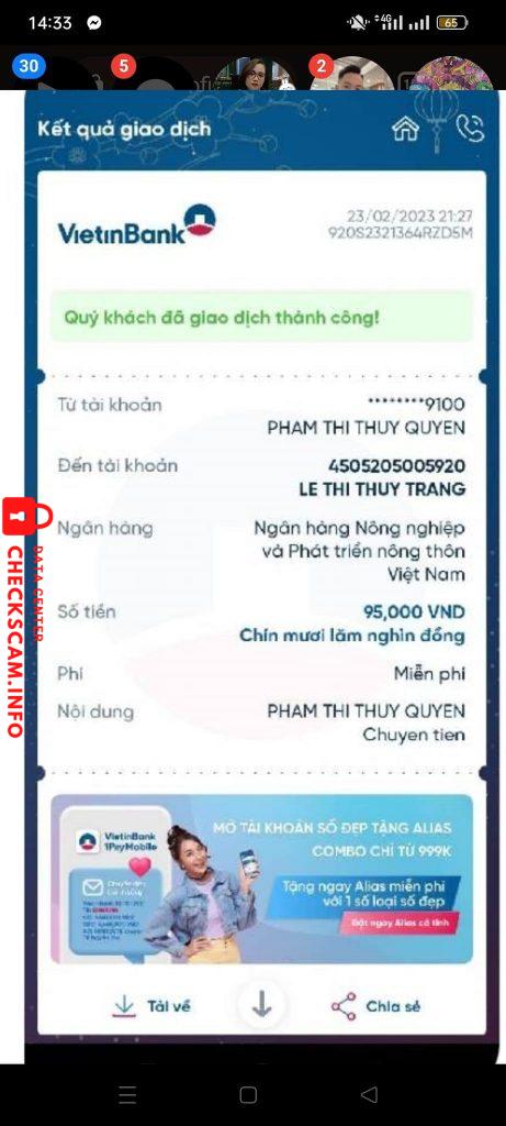 Scammer Alert: Le Thi Thuy Trang Reported: November 16, 2024 Scammer Information Full Name: Le Thi Thuy Trang Payment Gate: Agribank Payment Account: 4505205005920 Category: Marketplace scams Source: Checkscam Evidence Files Report Description Đã ck xong rồi block tk Comments Your comment Add Comment No comments yet. Be the first to share your experience with this scammer.
