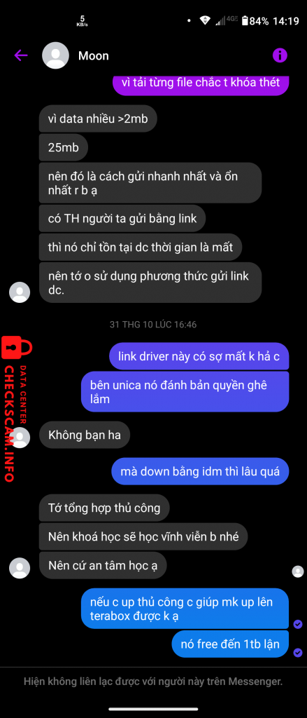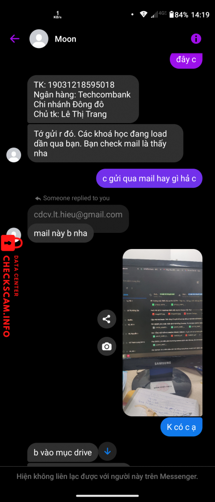 Scammer Alert: Lê Thị Trang Reported: November 16, 2024 Scammer Information Full Name: Lê Thị Trang Payment Gate: TECHCOMBANK Payment Account: 19031218595018 Category: Marketplace scams Source: Checkscam Evidence Files Report Description Scam bán khóa học,sau khi bank thì block Con này lừa nhiều rồi nên mọi người cẩn thận Comments Your comment Add Comment No comments yet. Be the first to share your experience with this scammer.