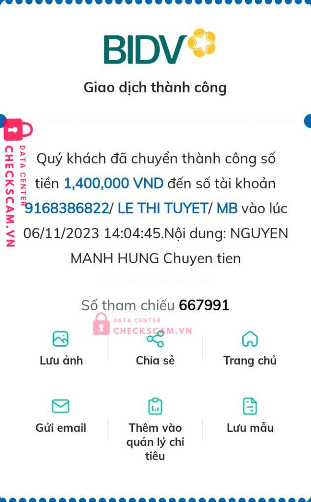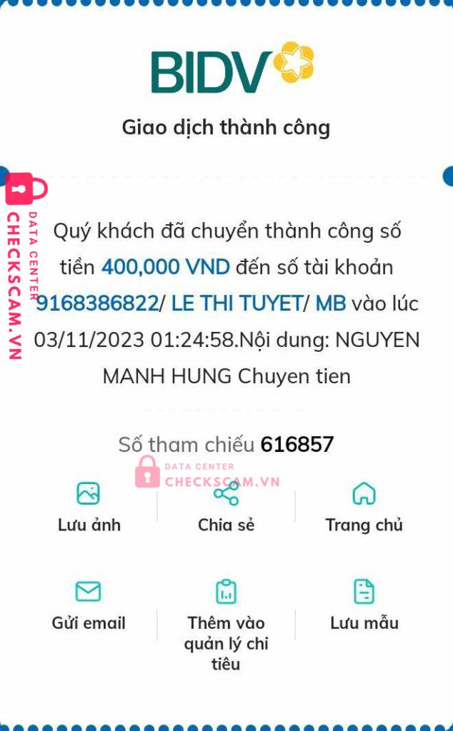 Scammer Alert: Le Thi Tuyet Reported: November 16, 2024 Scammer Information Full Name: Le Thi Tuyet Payment Gate: Mb bank Payment Account: 9168386822 Category: Marketplace scams Source: Checkscam Evidence Files Report Description scam 1m8 xog sủi vì lỡ ck full Comments Your comment Add Comment No comments yet. Be the first to share your experience with this scammer.