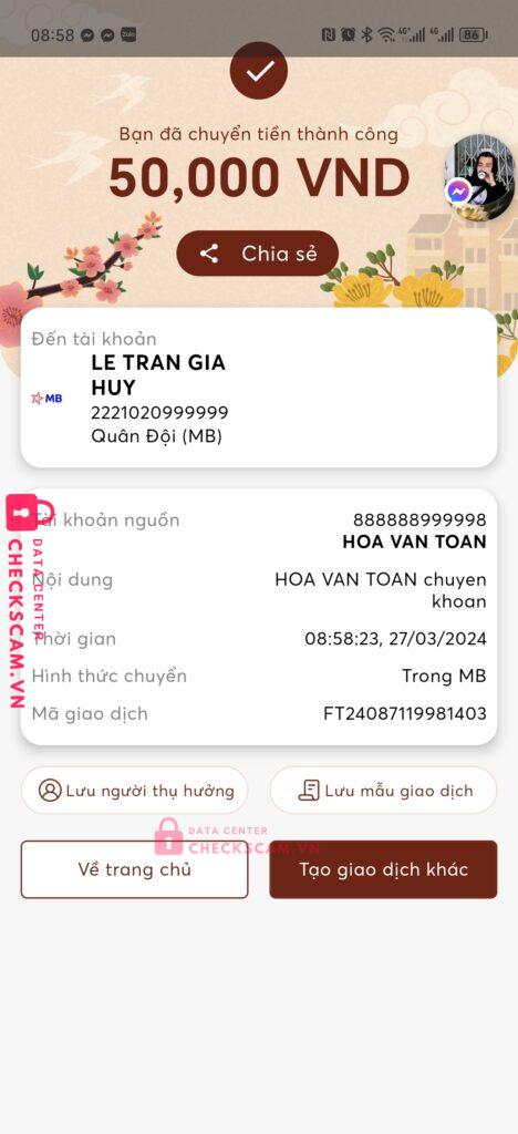Scammer Alert: Le tran gia huy Reported: November 16, 2024 Scammer Information Full Name: Le tran gia huy Payment Gate: Mb bank Payment Account: 2221020999999 Category: Marketplace scams Source: Checkscam Evidence Files Report Description Bán chuột razer cọc song nó chặn luôn, tuy mất không nhiều nhưng ae cẩn thận Comments Your comment Add Comment No comments yet. Be the first to share your experience with this scammer.