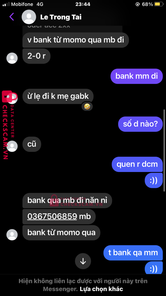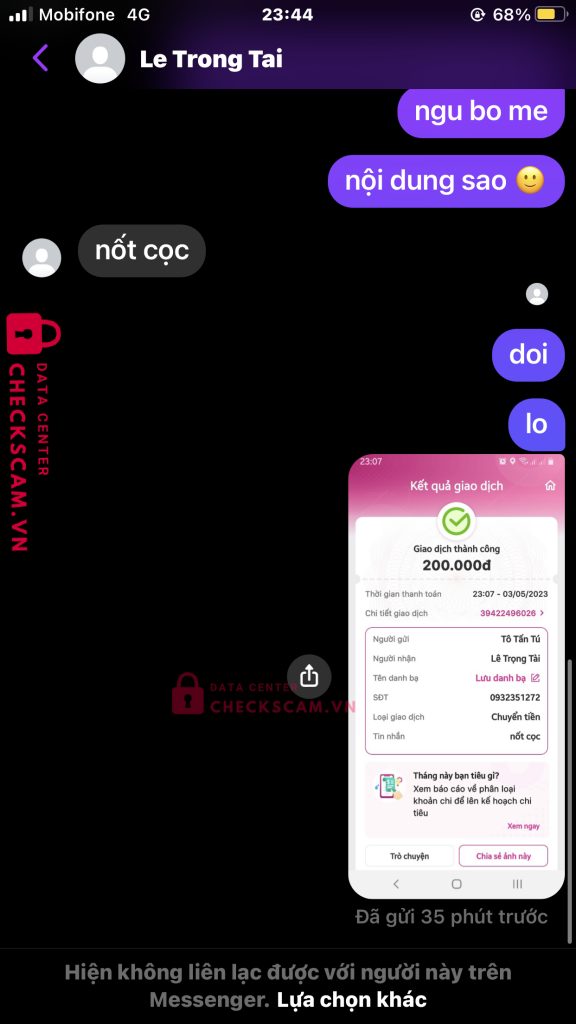 Scammer Alert: Lê Trọng Tài Reported: November 16, 2024 Scammer Information Full Name: Lê Trọng Tài Phone Number: 0932351272 Payment Gate: momo Payment Account: 0932351272 Category: Marketplace scams Source: Checkscam Evidence Files Report Description tôi bị bạn này scam 250k mua acc ff và những bill bạn này up đều là dựng đây là mb bank của bạn ấy 0367506859 Comments Your comment Add Comment No comments yet. Be the first to share your experience with this scammer.