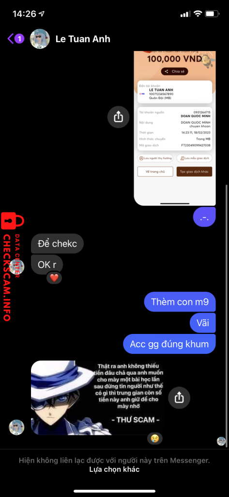Scammer Alert: Le Tuan Anh Reported: November 16, 2024 Scammer Information Full Name: Le Tuan Anh Payment Gate: Mb bank Payment Account: 10071234567890 Category: Marketplace scams Source: Checkscam Evidence Files Report Description Scam tổng giá trị 200k Comments Your comment Add Comment No comments yet. Be the first to share your experience with this scammer.