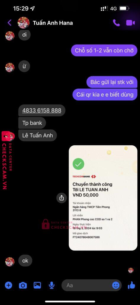 Scammer Alert: LE TUAN ANH Reported: November 16, 2024 Scammer Information Full Name: LE TUAN ANH Payment Gate: TMCP TIEN PHONG Payment Account: 48336158888 Category: Marketplace scams Source: Checkscam Evidence Files Report Description LỪA CỌC LỪA CK Comments Your comment Add Comment No comments yet. Be the first to share your experience with this scammer.