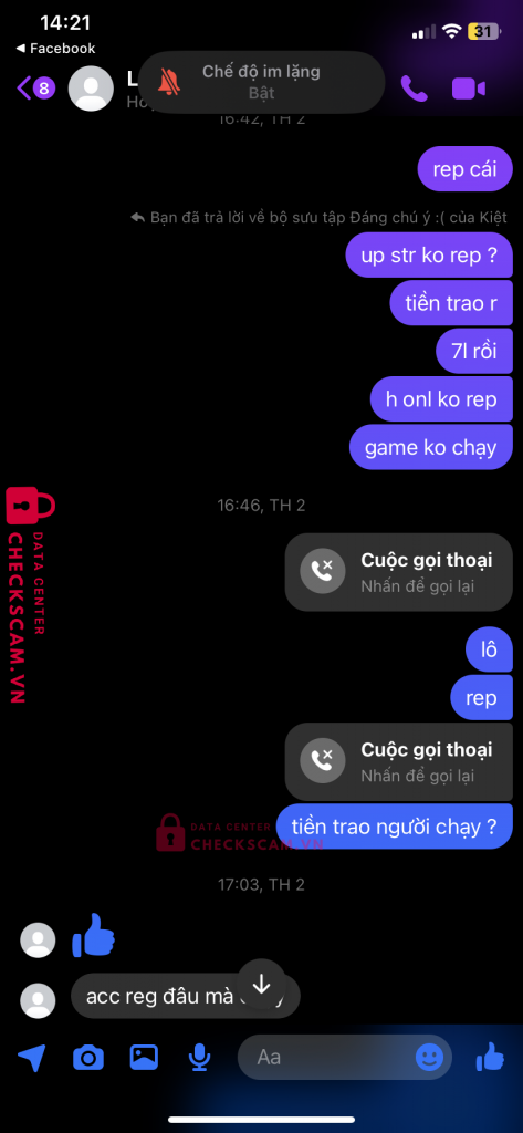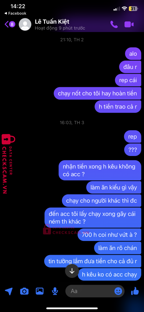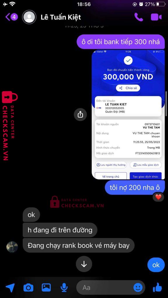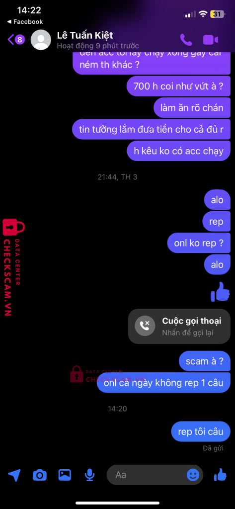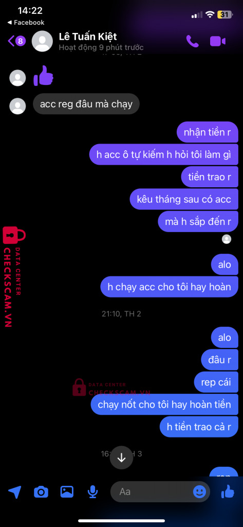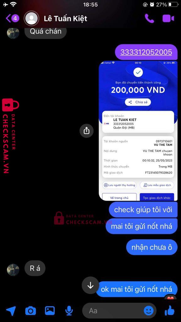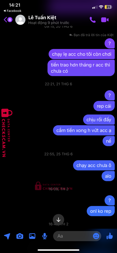 Scammer Alert: Lê Tuấn Kiệt Reported: November 16, 2024 Scammer Information Full Name: Lê Tuấn Kiệt Payment Gate: MB Bank Payment Account: 333312052005 Category: Marketplace scams Source: Checkscam Evidence Files Report Description nhận cày thuê acc liên quân đến thời gian đưa acc thì kêu bị ban acc xong không có acc reg để chạy lại . Giờ nhắn tin không rep Comments Your comment Add Comment No comments yet. Be the first to share your experience with this scammer.