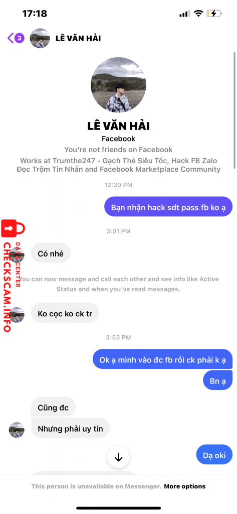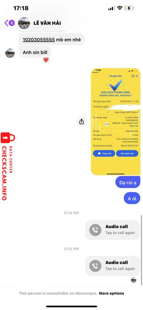 Scammer Alert: Lê văn hồng Reported: November 16, 2024 Scammer Information Full Name: Lê văn hồng Payment Gate: MB Bank Payment Account: 10203055555 Category: Marketplace scams Source: Checkscam Evidence Files Report Description Lừa đảo dịch vụ fb Call video quay hoàn thành tinh vi, rồi bắt chuyển khoản sau đó block Comments Your comment Add Comment No comments yet. Be the first to share your experience with this scammer.
