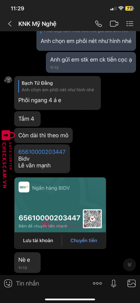 Scammer Alert: Lê Văn Mạnh Reported: March 7, 2025 Scammer Information Full Name: Lê Văn Mạnh Payment Gate: Bidv Payment Account: 65610000203447 Category: Marketplace scams Source: Checkscam Evidence Files Report Description Lừa tiền cọc và không thấy gửi hàng , tôi mua hàng từ tháng trước và chưa thấy gửi hàng cho tôi Comments Your comment Add Comment No comments yet. Be the first to share your experience with this scammer.