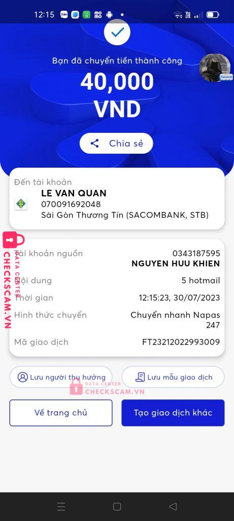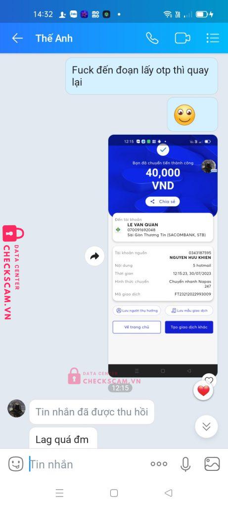 Scammer Alert: LE VAN QUAN Reported: November 16, 2024 Scammer Information Full Name: LE VAN QUAN Payment Gate: Sacombank Payment Account: 070091692048 Category: Marketplace scams Source: Checkscam Evidence Files Report Description lừa đảo mua mail nhưng không gửi mail Comments Your comment Add Comment No comments yet. Be the first to share your experience with this scammer.