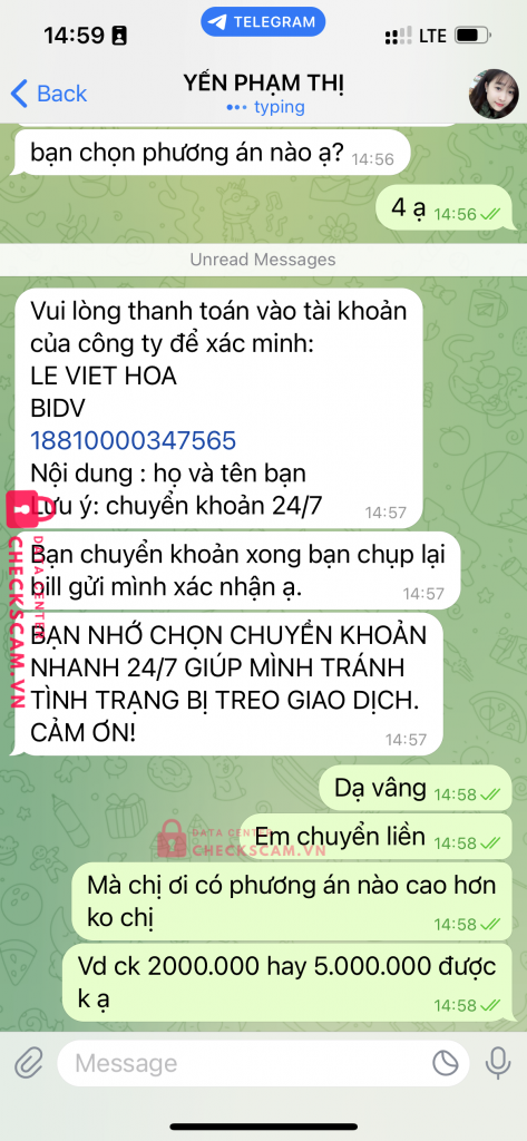 Scammer Alert: LE VIET HOA Reported: November 16, 2024 Scammer Information Full Name: LE VIET HOA Payment Gate: BIDV Payment Account: 18810000347565 Category: Marketplace scams Source: Checkscam Evidence Files Report Description Lừa đảo làm việc online qua ứng dunng telegram . Bảo chuyển khoản trước làm nhiệm vụ Comments Your comment Add Comment No comments yet. Be the first to share your experience with this scammer.