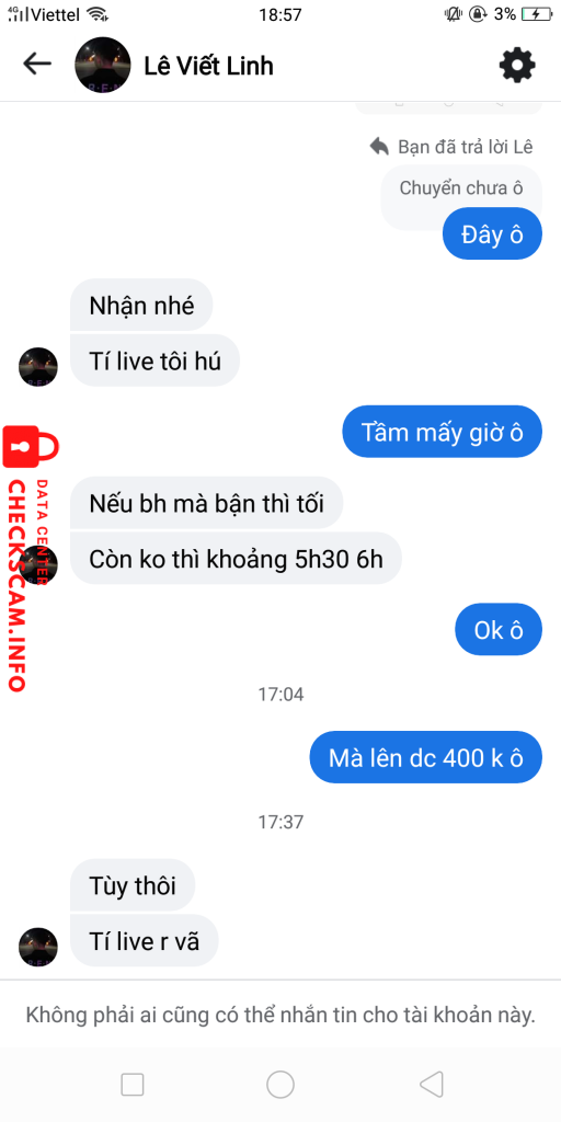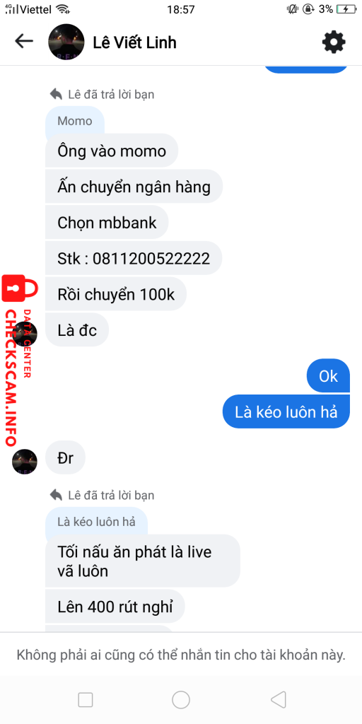 Scammer Alert: Lê Viết Linh Reported: November 16, 2024 Scammer Information Full Name: Lê Viết Linh Payment Gate: MBBANK Payment Account: 0811200522222 Category: Marketplace scams Source: Checkscam Evidence Files Report Description Nhận kéo cltx xong block Comments Your comment Add Comment No comments yet. Be the first to share your experience with this scammer.