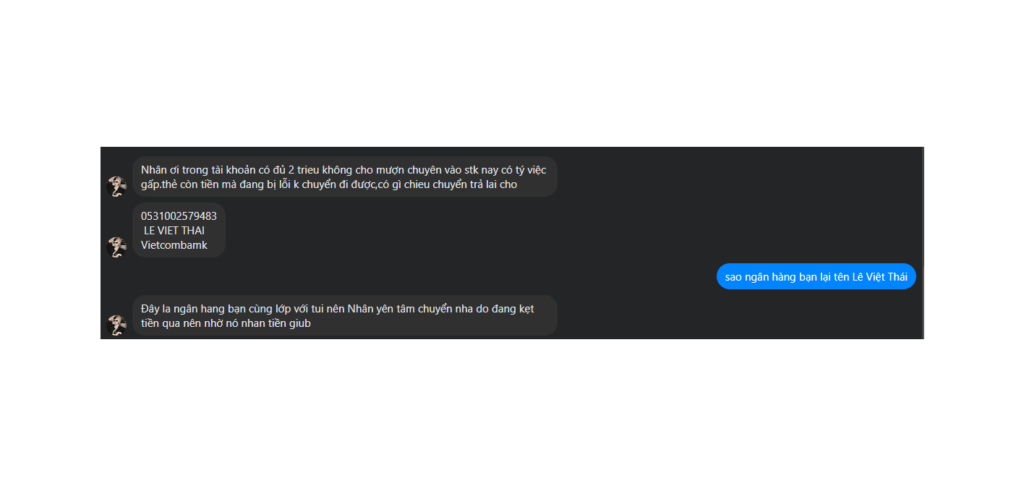 Người này hack facebook của một người bạn tôi, sau đó nhắn tin với tâm thế cần tiền gấp mà thẻ đang lỗi, yêu cầu tôi chuyển tiền vào tài khoản ngân hàng “0531002579483