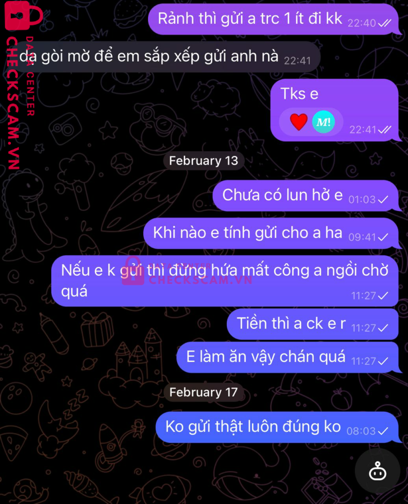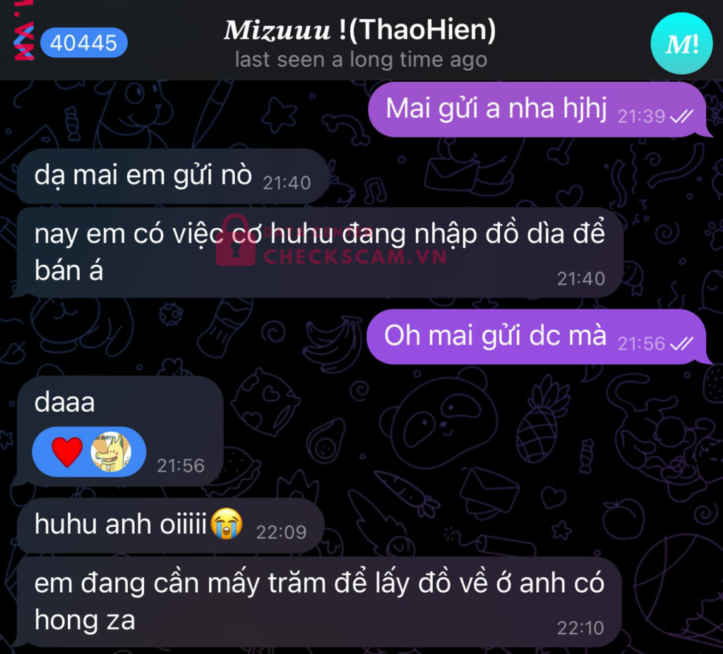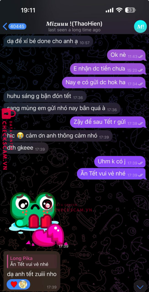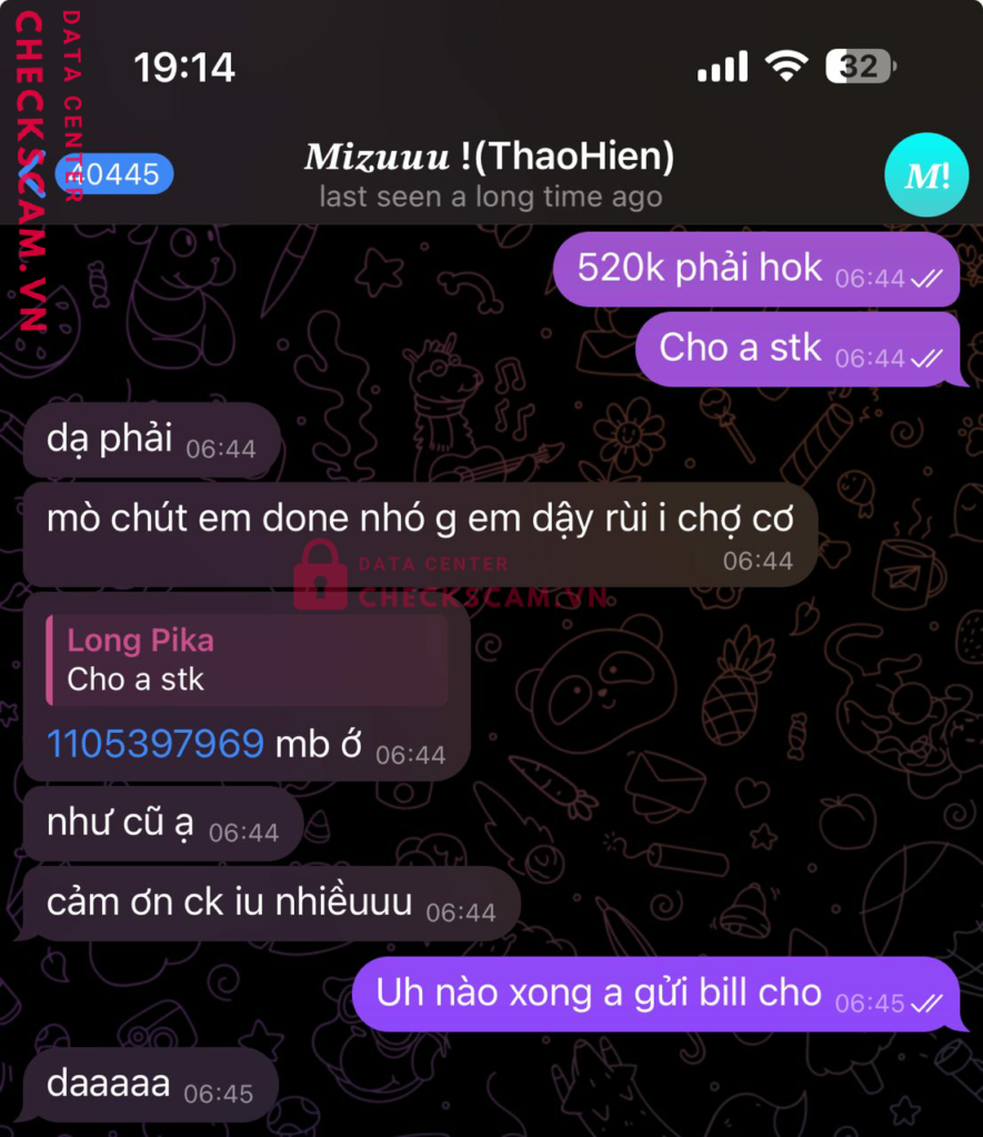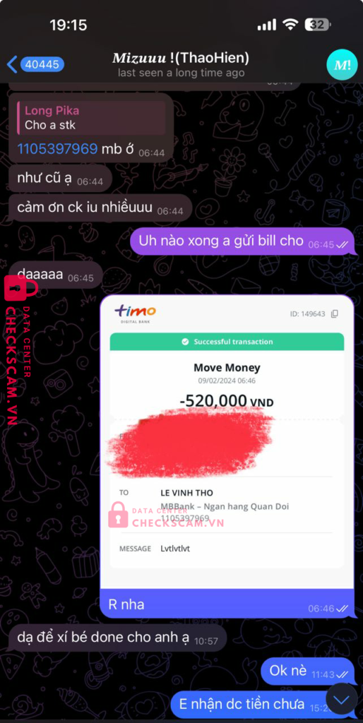 Scammer Alert: LE VINH THO Reported: November 16, 2024 Scammer Information Full Name: LE VINH THO Payment Gate: MB Bank Payment Account: 1105397969 Category: Marketplace scams Source: Checkscam Evidence Files Report Description Gửi tiền mua album ảnh nhưng ko gửi và chặn tin nhắn trên telegram Tên ?????? !(ThaoHien) Comments Your comment Add Comment No comments yet. Be the first to share your experience with this scammer.
