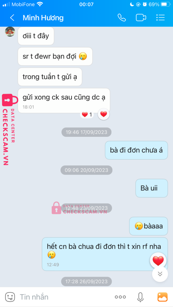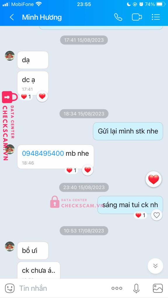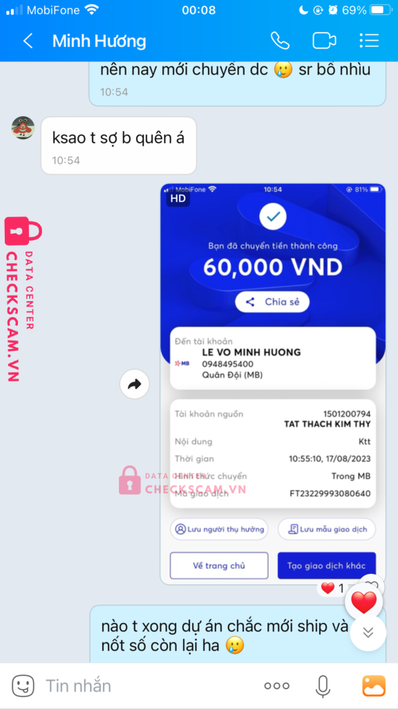 Scammer Alert: LE VO MINH HUONG Reported: November 16, 2024 Scammer Information Full Name: LE VO MINH HUONG Payment Gate: MB Bank Payment Account: 0948495400 Category: Marketplace scams Source: Checkscam Evidence Files Report Description Nhây ship, không rep tin nhắn, scam, nhỏ này chỉ biết thông tin ở Thị trấn Thạnh Hóa, Long An thui, còn lại t chịu, né stk này ra nha mng Comments Your comment Add Comment No comments yet. Be the first to share your experience with this scammer.