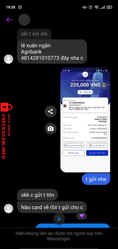 Scammer Alert: LE XUAN NGAN Reported: November 16, 2024 Scammer Information Full Name: LE XUAN NGAN Payment Gate: agribank Payment Account: 4814281010773 Category: Marketplace scams Source: Checkscam Evidence Files Report Description nó scam giấy bo góc của tui mng oi Comments Your comment Add Comment No comments yet. Be the first to share your experience with this scammer.
